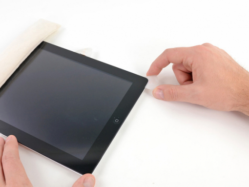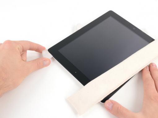 Une partie de l'adhésif le long du périmètre de l'iPad aurait pu se recoller. Si c'est le cas, faire glisser le médiator sous le bord de l'iPad où la vitre avant est toujours collée et "couper" l'adhésif.