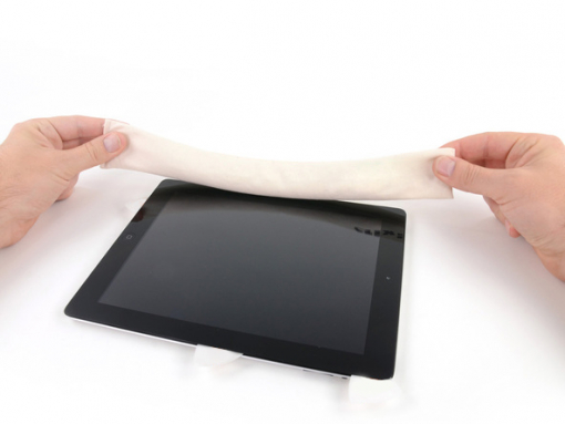 Poser l'iOpener à plat sur le bord droit de l'iPad, en le lissant de telle sorte qu'il y ait un bon contact entre la surface de l'iPad et de l'iOpener.