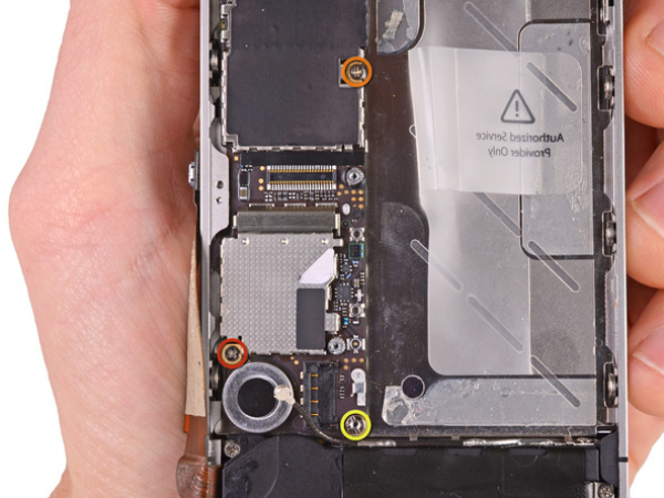 Soulever délicatement la carte mère à partir de l'extrémité la plus proche du haut-parleur et l'écarter du bord supérieur de l'iPhone