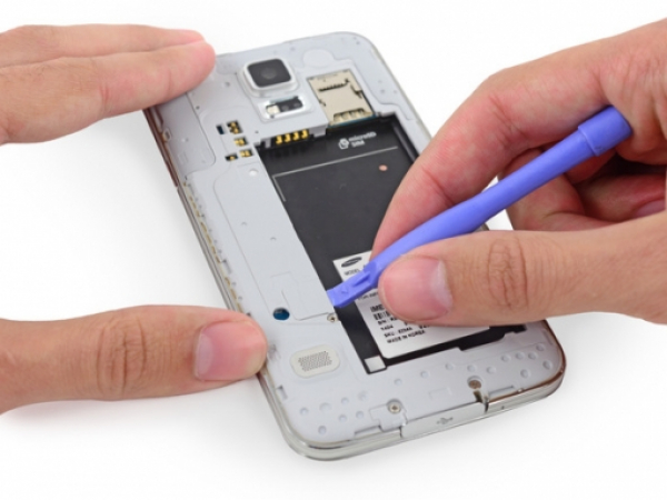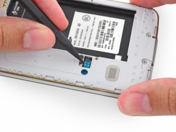 • Il y a un creux dans le coin inférieur droit de la batterie de votre téléphone. Une fois de plus, pousser avec un outil d'ouverture en plastique ou avec votre ongle dans le creux et soulevez la batterie.