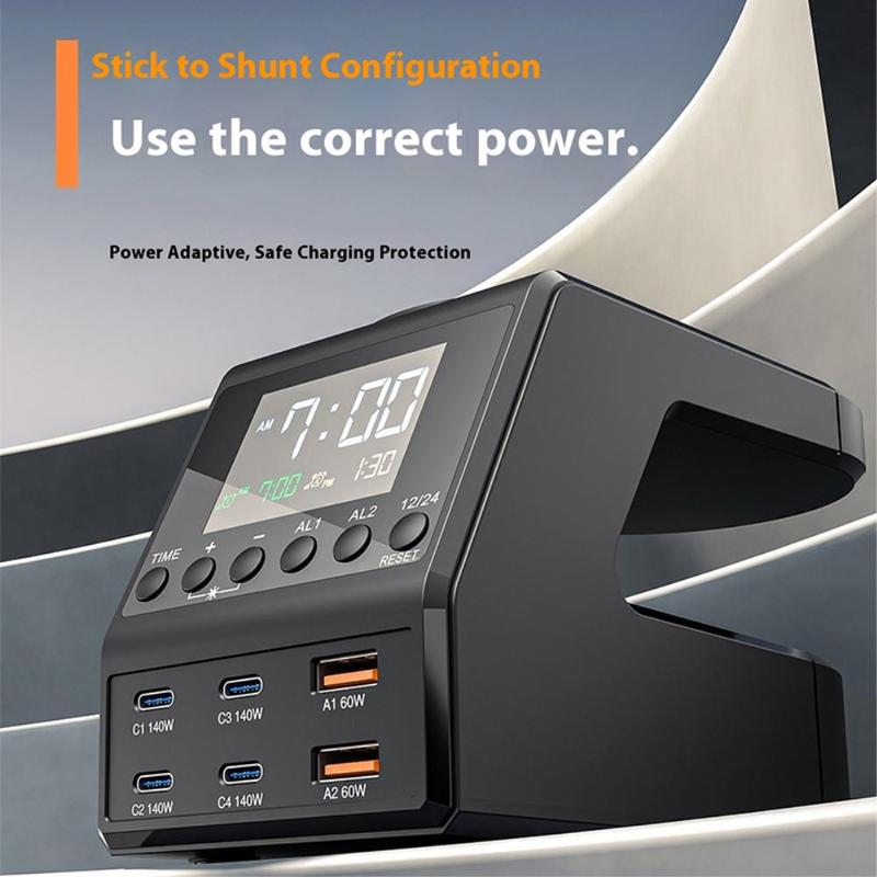 Équipée de quatre ports Type-C (chacun prenant en charge jusqu'à 140 W) et de deux ports USB-A (jusqu'à 60 W), cette station alimente facilement six appareils en même temps. Qu'il s'agisse d'ordinateurs portables, de tablettes, de wearables ou d'accessoires, chaque port est conçu pour des performances et une distribution d'énergie maximales.