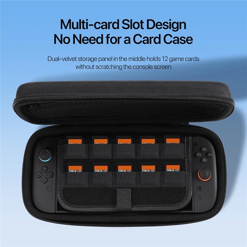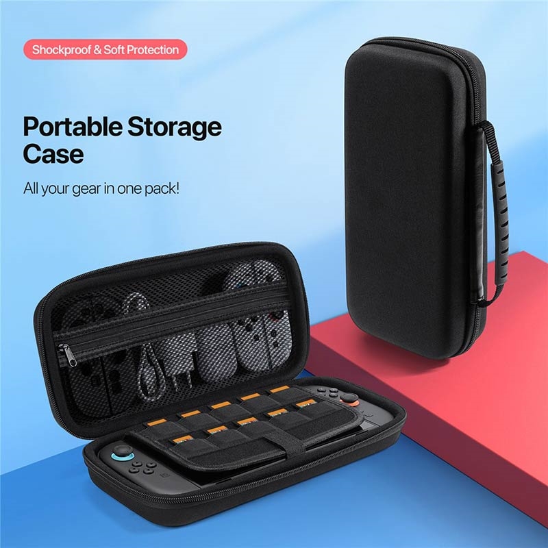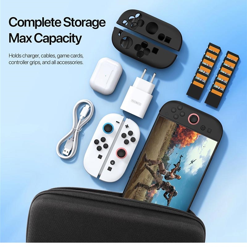 - Large espace intérieur pour les chargeurs, les câbles de données et les grips Joy-Con, pour que tout soit bien rangé au même endroit.