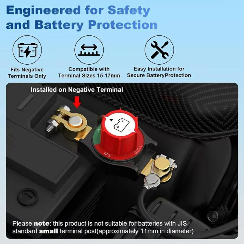 Utilisez-le dans une voiture stationnée plusieurs jours d'affilée, dans un camion nécessitant une coupure fiable de la batterie pendant l'entretien, dans un camping-car pendant le remisage hors saison, ou dans un bateau pour éviter toute décharge indésirable lorsque celui-ci n'est pas utilisé. Il est également utile pour les installations de camping et autres systèmes alimentés par batterie où une isolation rapide est importante.