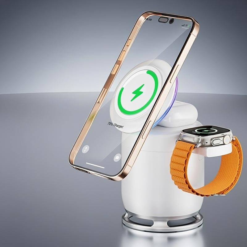 - Chargement 3 en 1 : téléphone 15W + montre 2,5 W + écouteurs 5 W simultanément