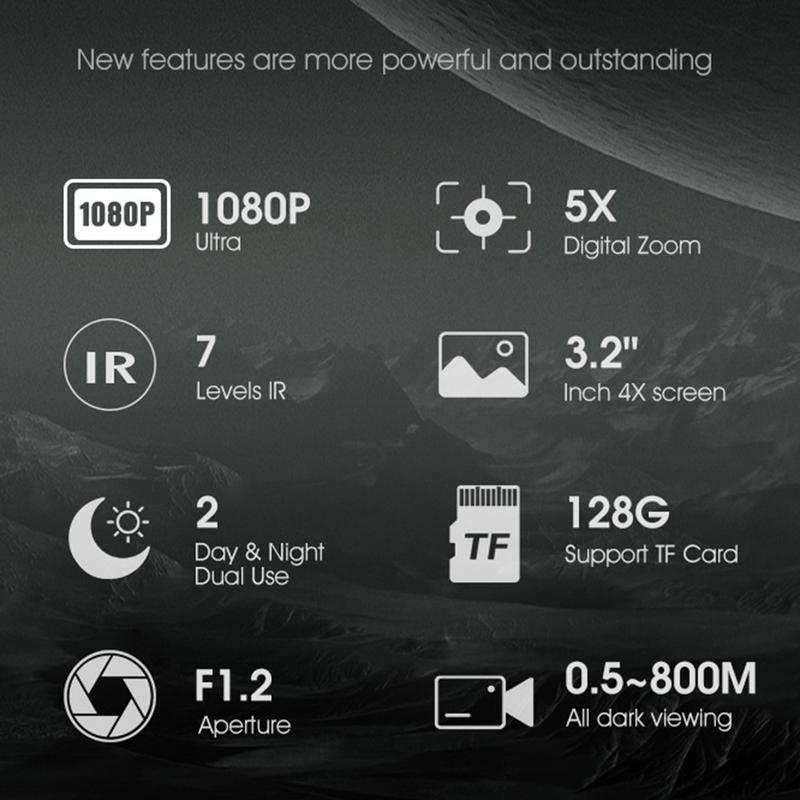 Ces jumelles associent une puissante vision infrarouge à longue portée à des capacités d'enregistrement haute définition, ce qui en fait un outil polyvalent pour les professionnels et les amateurs d'activités de plein air. L'ouverture F1.2 et le capteur de lumière des étoiles offrent une clarté impressionnante même sans IR, tandis que le mode IR complet permet une visibilité jusqu'à 300 m dans l'obscurité totale. Avec l'exportation facile des médias, un grand écran de 3 pouces et la prise en charge d'un stockage étendu, la R12 offre fiabilité, performance et valeur à long terme.