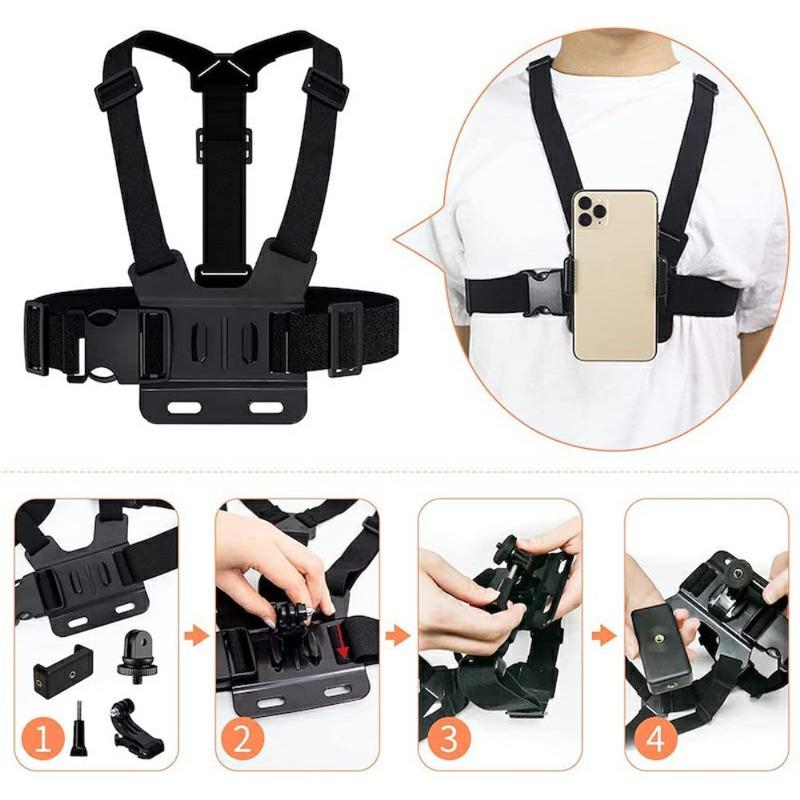 Compatible avec la série GoPro Hero et la plupart des caméras d'action qui utilisent des supports et adaptateurs standard de type GoPro. Une pince pour téléphone est également incluse pour filmer avec un smartphone.