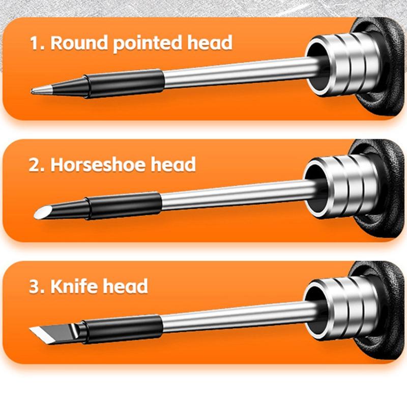 - Comprend trois embouts interchangeables : rond pointu, en fer à cheval et en couteau