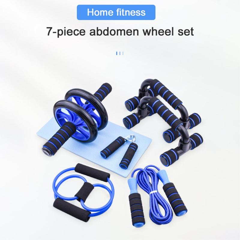 Kit d'entraînement à domicile 7 pièces - Rouleau abdominal, barres de pompes, corde à sauter, pince à main et extenseur thoracique