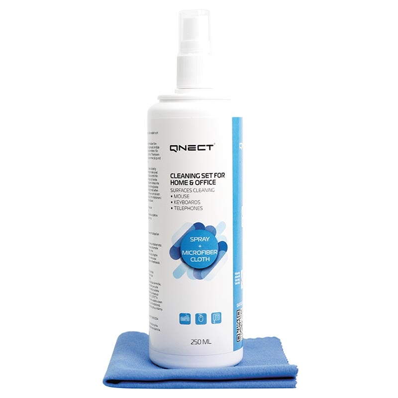 - Ce set de nettoyage Qnect combine un chiffon doux et un spray désinfectant de 250ml