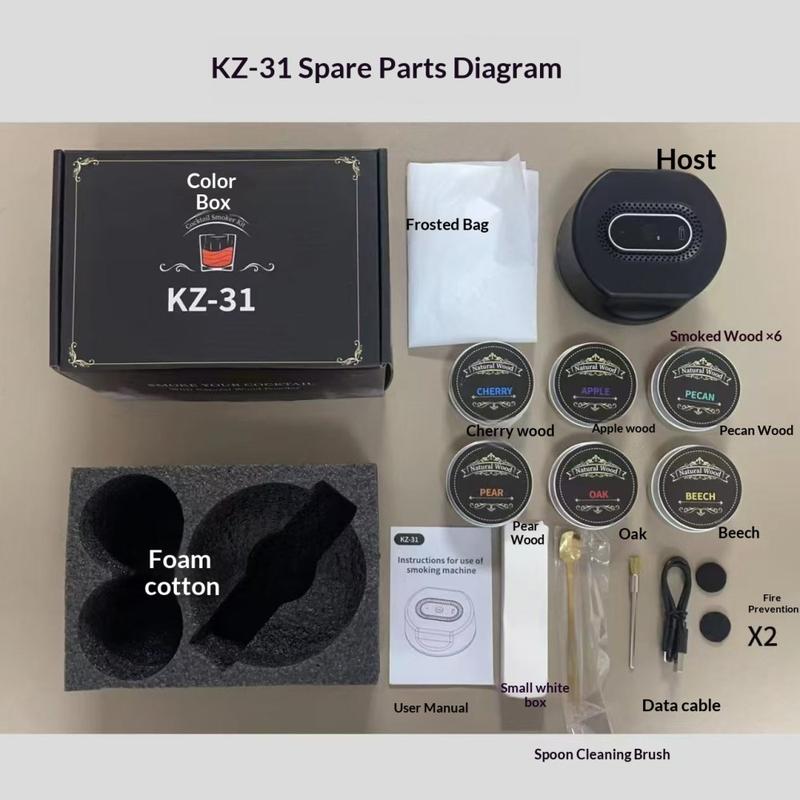 • KZ-31 Kit de fumage électrique rechargeable pour cocktails - Infuseur de fumée automatique avec 6 saveurs de copeaux de bois