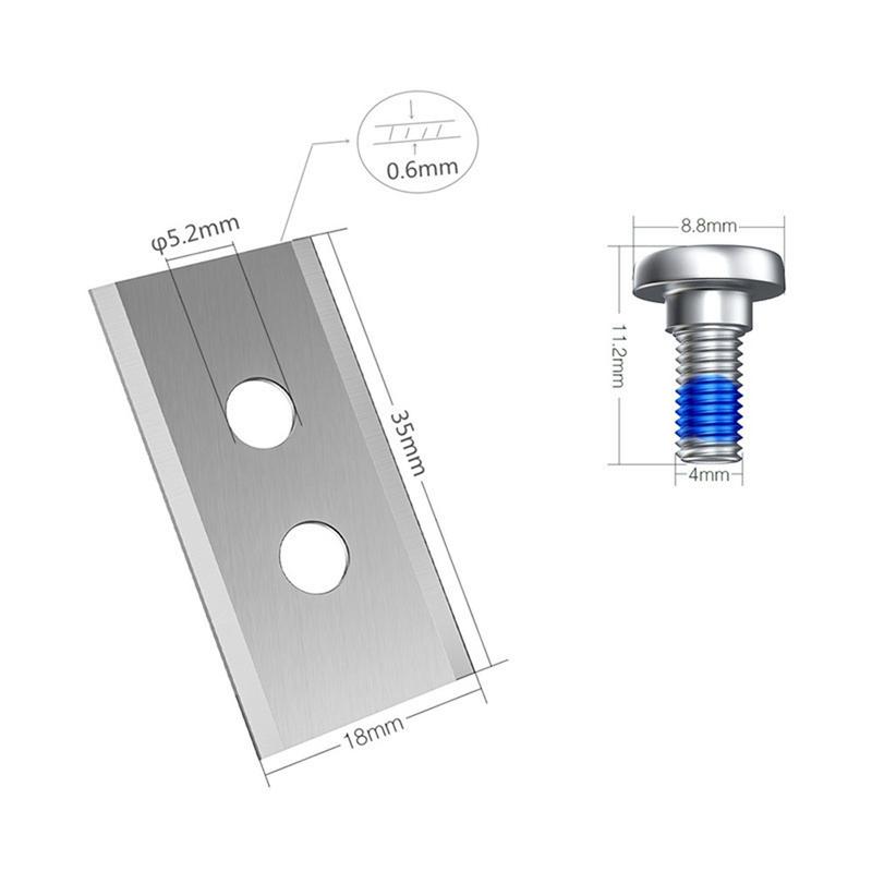 Avec des dimensions précises de 35 x 18 x 0,75 mm et un système de fixation à deux trous, les lames sont conçues pour un ajustement sûr et un fonctionnement stable sur les tondeuses robotisées compatibles. Le kit comprend également des vis assorties avec un frein-filet bleu pour empêcher tout desserrage pendant l'utilisation, rendant ainsi l'entretien plus facile et plus fiable.