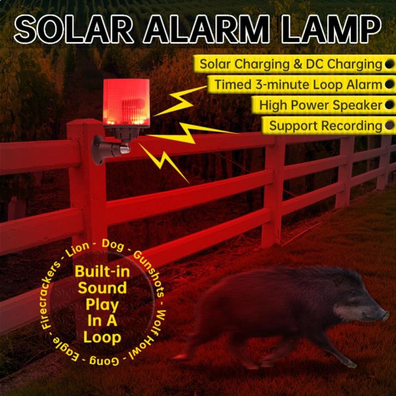 Assurez la sécurité des jardins, des vergers et des chantiers de construction 24 heures sur 24. Le N911L combine une sirène de 129dB, huit LED rouges clignotantes et une bibliothèque de sons d'avertissement sélectionnables (aboiements de chiens, hurlements de loups, pétards, etc.) pour effrayer les voleurs et les animaux sauvages. Un panneau solaire monocristallin recharge la batterie de 1 200 mAh pendant la journée, tandis que l'électronique intelligente déclenche une salve de sons et de lumières de 20 secondes toutes les trois minutes après la tombée de la nuit. Besoin de quelque chose de personnalisé ? Enregistrez votre propre message de 20 secondes en appuyant sur un bouton. Pas de câblage, des coûts d'exploitation minimes - juste une protection fiable et résistante aux intempéries, partout où vous en avez besoin.