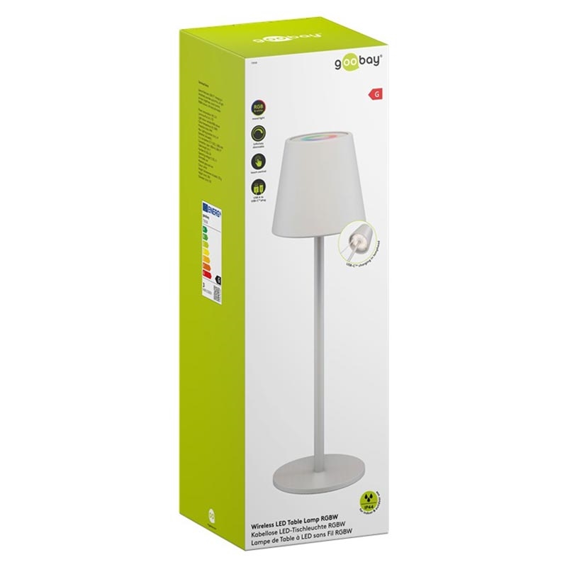Lampe de table LED sans fil Goobay RGBW - Commande tactile, blanc chaud 3000 K + couleurs RGB, intensité réglable en continu, rechargeable via USB-C, IP44