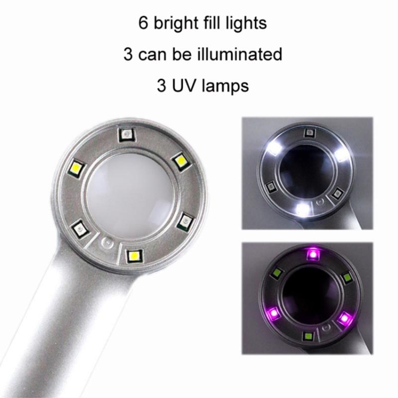 La loupe comprend 6 lampes à haute luminosité : 3 lampes LED blanches pour un éclairage clair et 3 lampes UV pour les besoins d'inspection particuliers. L'interrupteur à poussoir permet de basculer facilement entre la lumière blanche et la lumière UV violette, s'adaptant ainsi aux différents scénarios d'observation.