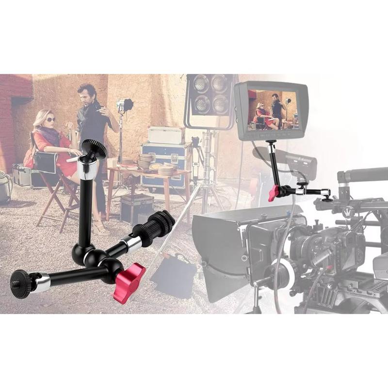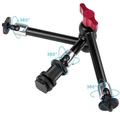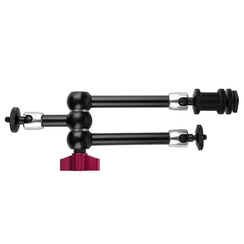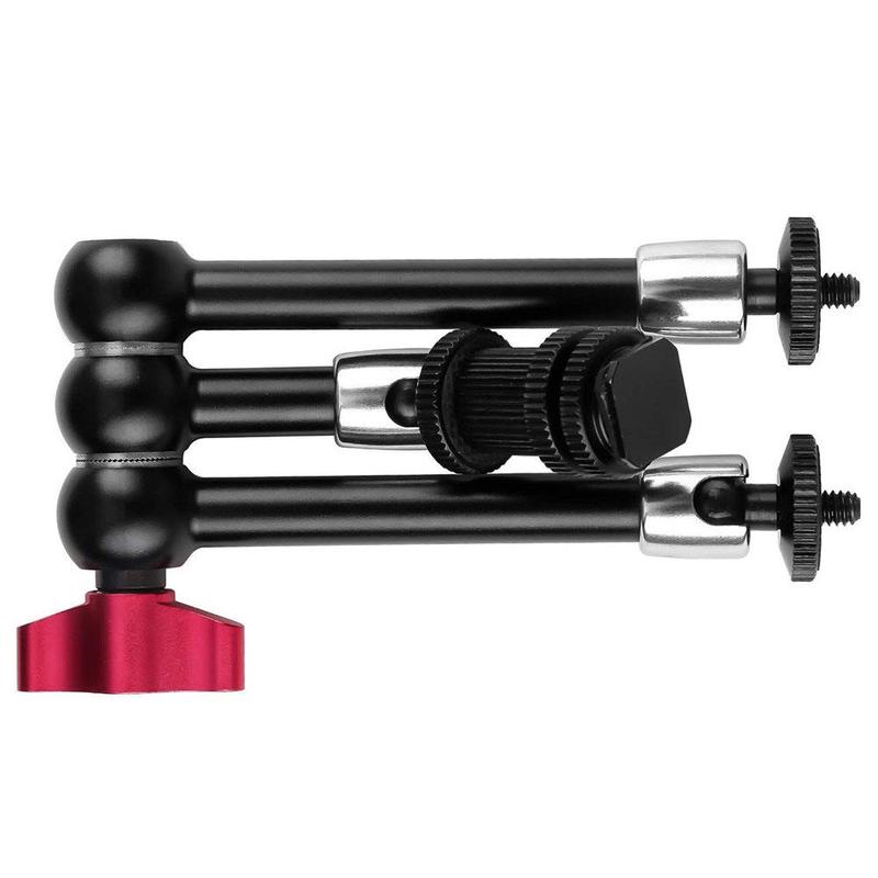 Fabriqué en alliage d'aluminium et en acier inoxydable, ce support offre une structure solide et durable avec un système d'engrenage métallique pour un positionnement plus sûr. Le réglage à 360° sur toutes les articulations facilite le réglage précis des angles, tandis que la griffe porte-accessoire et le support de fixation 1/4" lui confèrent une large compatibilité avec les appareils photo reflex numériques et les accessoires associés. Les poignées rouges à verrouillage rapide permettent une installation et un repositionnement rapides sans outils, ce qui contribue à rationaliser votre flux de travail pendant la prise de vue.