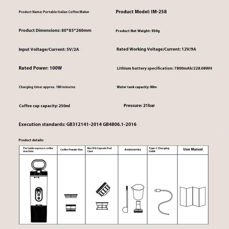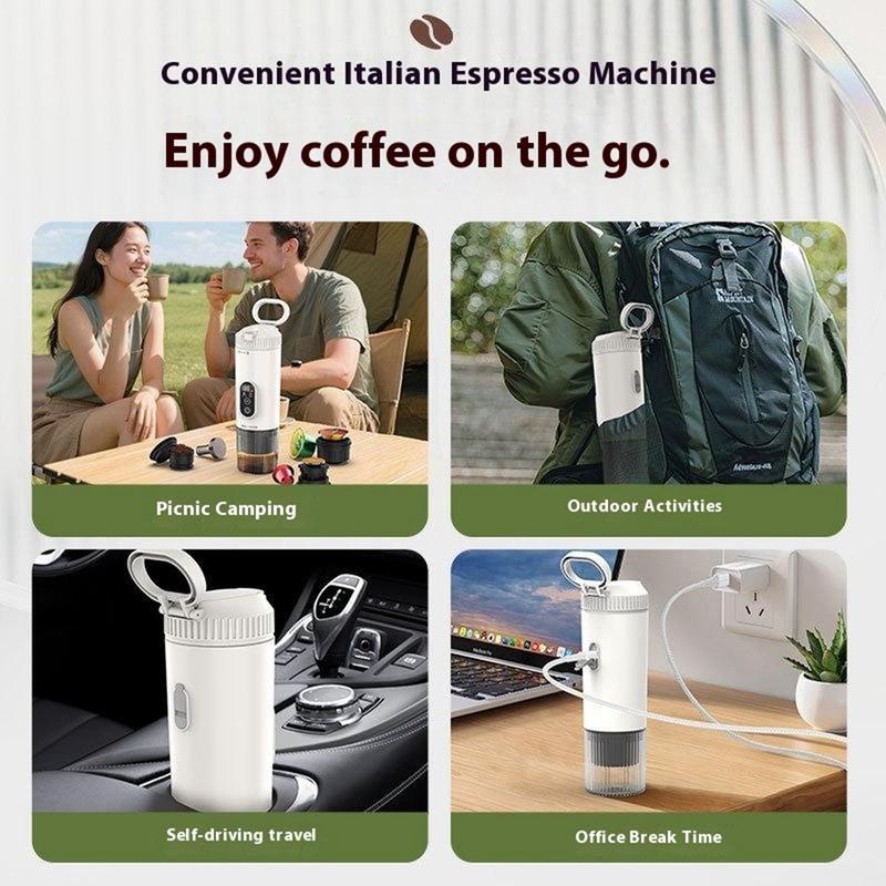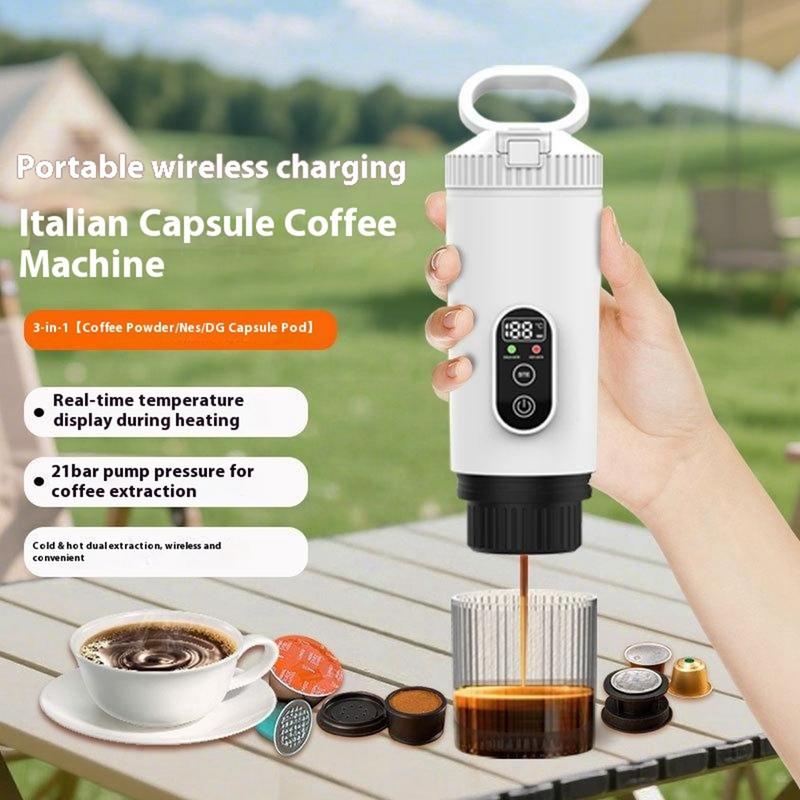 Machine à espresso portable 3-en-1 - Cafetière électrique sans fil à capsules avec batterie 7500mAh pour la voiture, la maison et l'extérieur - Compatible avec les capsules Nespresso, DolceGusto et le café en poudre