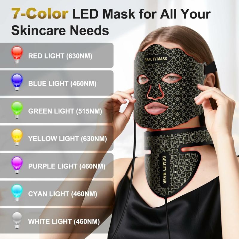 Masque de beauté à luminothérapie LED 7 couleurs – Appareil de rajeunissement de la peau du visage et du cou avec 3 niveaux d'intensité