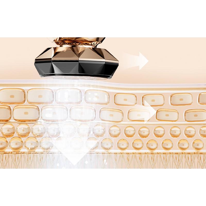 - Tête plate avec revêtement durable en or 18 carats pour une diffusion douce et homogène de l'énergie.