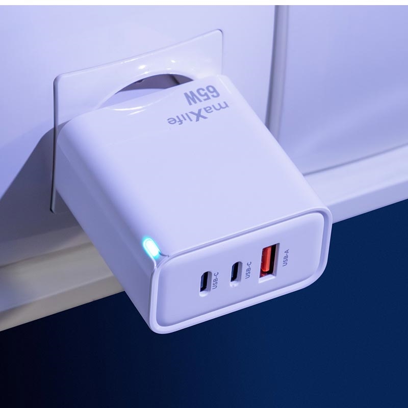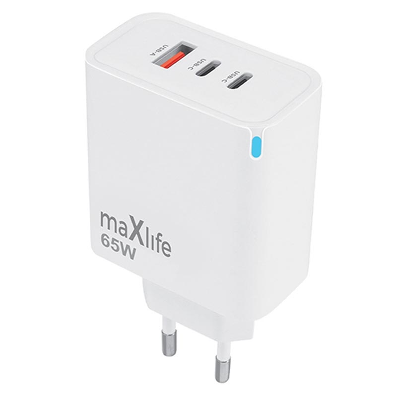Maxlife MXTC-09-65ACC Chargeur GaN - Adaptateur de charge rapide 65W avec 2× USB-C PD et 1× USB-A QC Ports