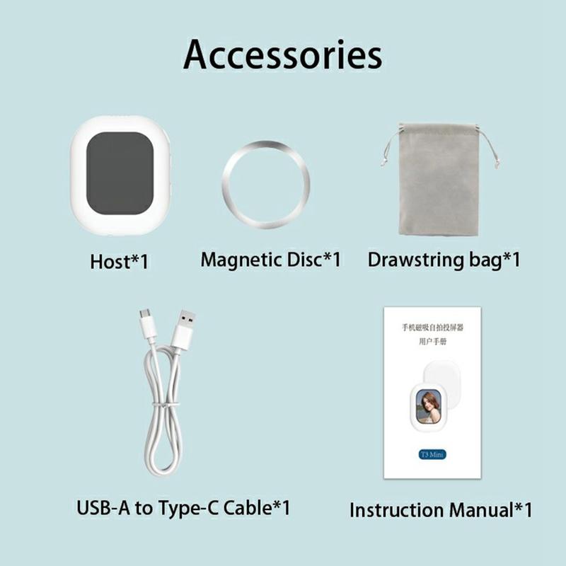 Le T3 Mini, un dispositif sans fil de duplication d'écran pour téléphone, est un accessoire compact et pratique conçu pour faciliter la prise de selfies, le vlogging, la création de contenu et la prise de photos avec l'appareil photo arrière. Grâce à sa fixation magnétique instantanée, à la duplication d'écran sans fil et à son écran IPS lumineux de 2,01 pouces, il vous permet de prévisualiser en temps réel l'image de la caméra arrière de votre téléphone sans configuration compliquée. Sa conception légère le rend facile à transporter partout, ce qui en fait un outil utile pour les photos quotidiennes, les courtes vidéos, les diffusions en direct et les contenus de voyage.