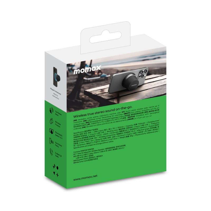 La mini enceinte Bluetooth magnétique MOMAX 1-Vibe Go BS6 est une solution audio compacte et polyvalente conçue pour le divertissement quotidien à la maison ou en déplacement. Son design magnétique ultra-mini combine une enceinte sans fil portable avec un support pratique pour téléphone, vous permettant de profiter facilement de votre musique, de vos vidéos et de vos appels. Équipée d'unun puissant haut-parleur de 40 mm et d'unune sortie sonore à 360°, elle offre un son immersif dans un format étonnamment petit, tandis que sa résistance à 'eau IPX6 la rend adaptée à une utilisation quotidienne dans différents environnements.