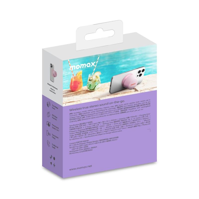 Mini haut-parleur Bluetooth magnétique et support pour téléphone Momax 1-Vibe Go BS6, son à 360° et étanchéité IPX6