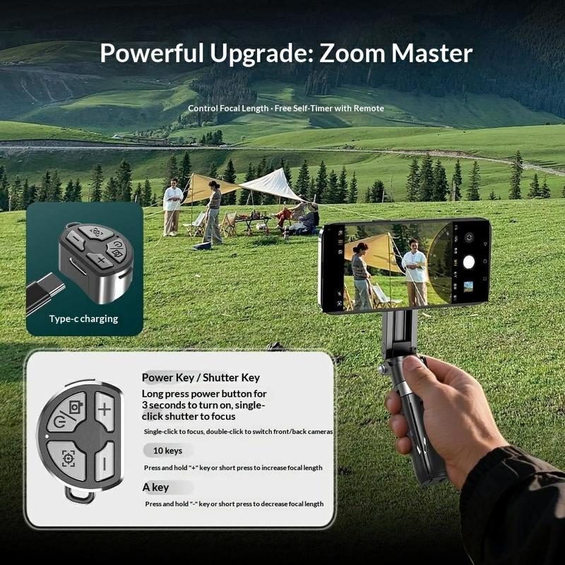 La télécommande Bluetooth 5.2 incluse vous permet de déclencher des photos et des vidéos à une distance maximale de 10 mètres. Elle permet de basculer entre les caméras avant et arrière, de zoomer et de faire la mise au point, ce qui vous donne un contrôle total sans toucher votre téléphone.