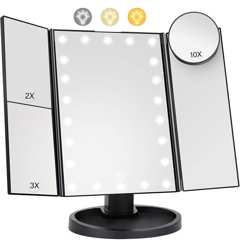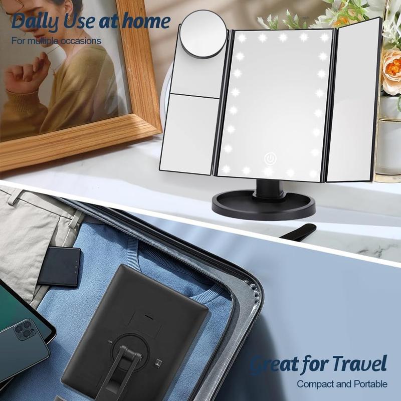 • Miroir de maquillage pliable sur 3 côtés avec 22 lumières LED - Miroir de courtoisie grossissant 1X/2X/3X/10X