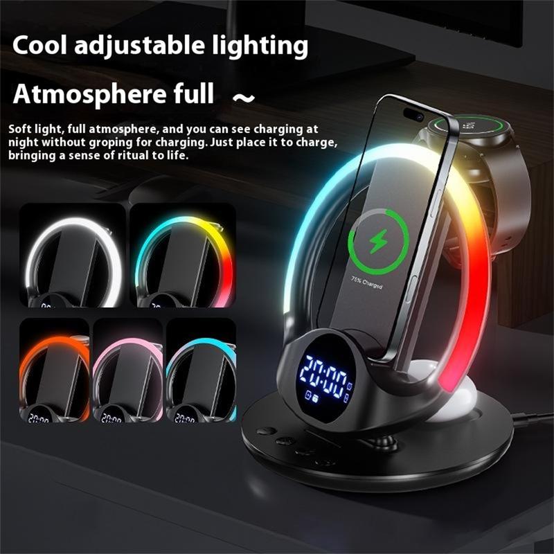 Plus qu'un simple chargeur, il fait également office d'horloge numérique et de support de téléphone. Choisissez parmi cinq modes de rétroéclairage LED ambiant (blanc, blanc rosé, rouge, bleu glacier, couleur fantaisie) pour vous adapter à votre humeur ou à votre décor.