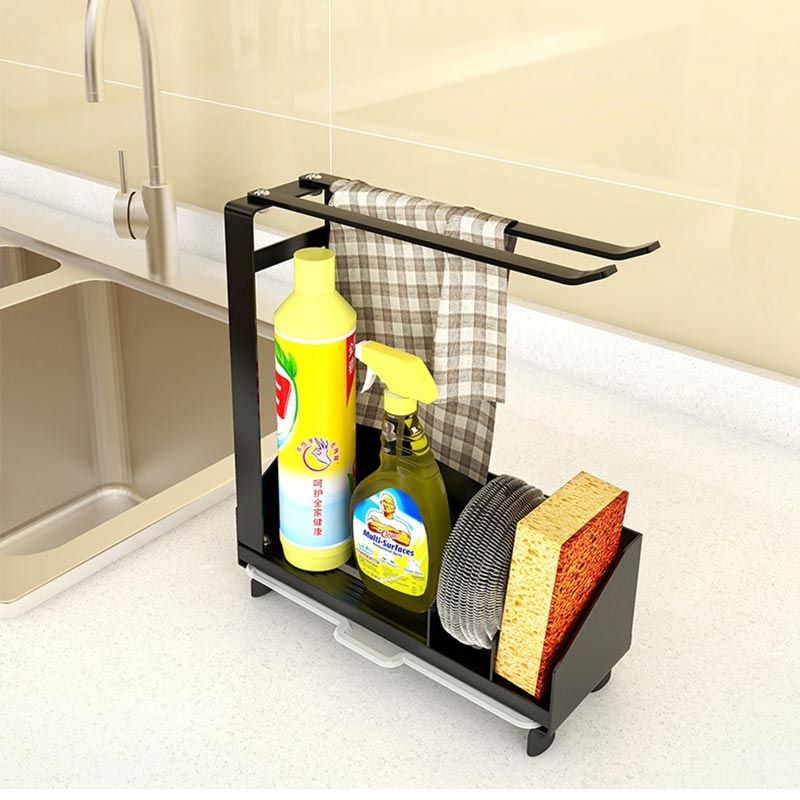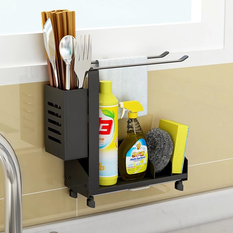 - Conception multicouche pour un rangement organisé des éponges, des brosses à vaisselle, du savon et des brosses à récurer.