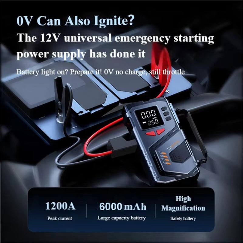 • H06 Pompe à air sans fil pour voiture avec démarreur d'urgence, lampe de poche, affichage numérique et fonction SOS - 6000mAh/120W