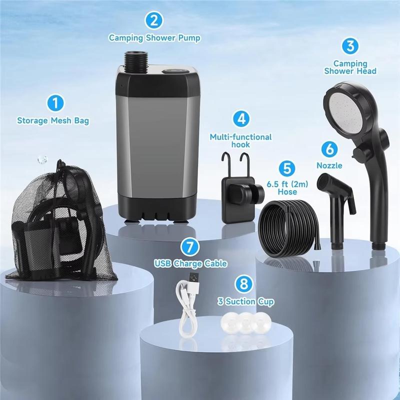 Cette pompe de douche électrique portable est conçue pour rendre la toilette en extérieur plus facile, plus confortable et plus flexible, où que vous alliez. Dotée d'une batterie intégrée de 6000mAh, d'une protection étanche IPX7 et d'un écran numérique intelligent, elle constitue un choix pratique pour le camping, les voyages en camping-car, les sorties à la plage, la randonnée, la toilette des animaux de compagnie et le nettoyage en extérieur. Son design sans fil et son kit d'accessoires complet vous permettent de profiter d'une installation de douche plus pratique sans dépendre d'une source d'eau fixe ou d'une prise de courant.