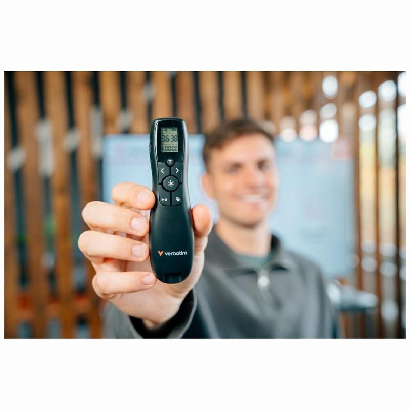 • Présentateur sans fil Verbatim Keynote avec écran LCD - Minuterie, laser rouge 100 m, portée sans fil 30 m - Récepteur USB-A + adaptateur USB-C