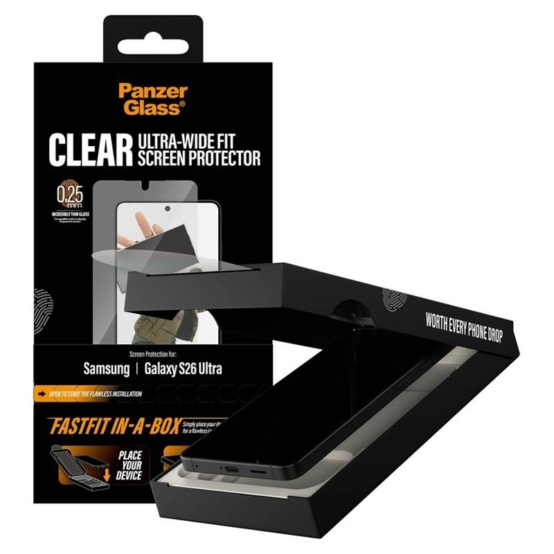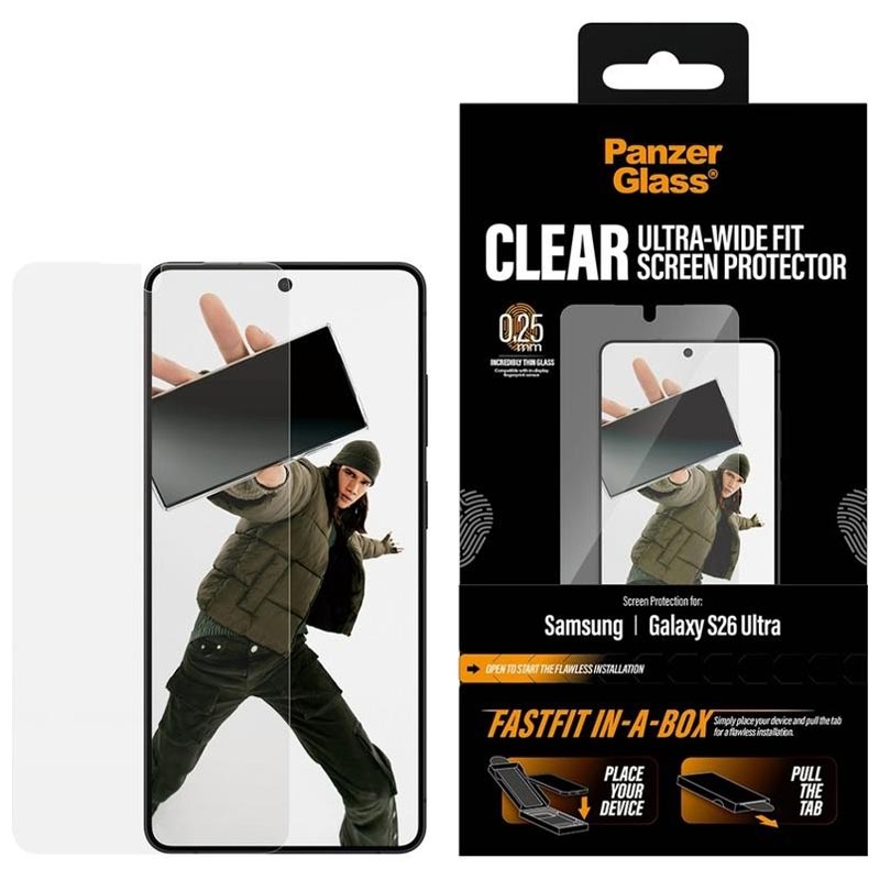 La protection d'écran PanzerGlass Ultra-Wide Fit pour Samsung Galaxy S26 Ultra est conçue pour une installation rapide et sans bulles grâce au système innovant FASTFIT IN-A-BOX. Placez simplement votre Samsung Galaxy S26 Ultra face vers le haut, tirez sur la languette et profitez d'un protecteur parfaitement aligné à chaque fois - pas de poussière, pas de frustration.