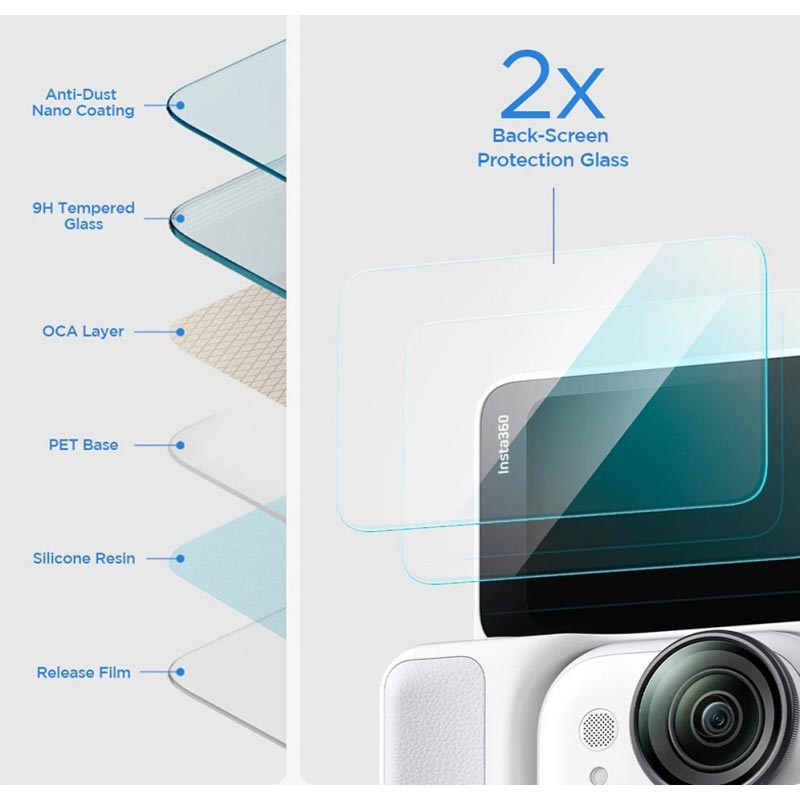 Le verre trempé de 0,3mm d'épaisseur est doté de la dureté 9H standard de l'industrie, il résiste donc aux rayures causées par les clés, les pièces de monnaie et d'autres objets dans votre sac à main ou vos poches. De plus, la surface oléophobe et les bords lisses 2.5D garantissent un entretien facile et un confort lors de la prise en main de votre Insta360 Go Ultra.