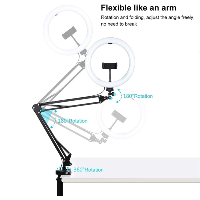 L'éclairage annulaire LED peut être monté sur le support et emmené n'importe où, il peut également être retiré du support à tout moment, la tête de trépied à rotule peut tourner sur 360 degrés et s'ajuster à n'importe quel angle (le support n'est pas inclus).