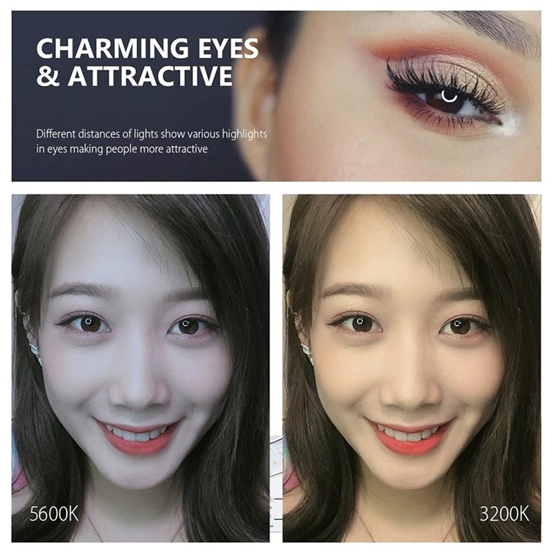 Mode d'éclairage 3 couleurs, luminosité réglable, vous pouvez ajuster la couleur et la luminosité très facilement, une bonne luminosité peut être obtenue sans installer de filtres colorés supplémentaires. Trois couleurs de lumière naturelle douce illuminent votre beauté en différentes occasions.