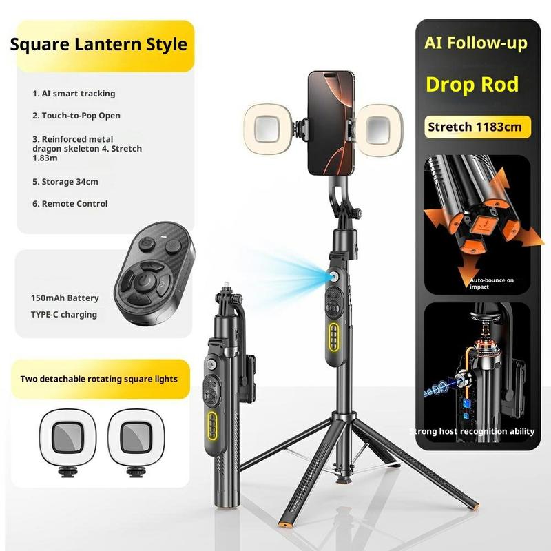 Perche à selfie quadripode Q625 de 1,83 m avec suivi IA Bluetooth, double éclairage d'appoint en forme de H, stabilisation d'image et télécommande
