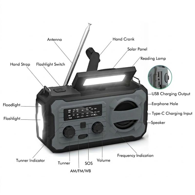 La radio intégrée avec bande météo vous permet de recevoir les alertes et les mises à jour d'urgence, tandis que la lampe torche LED 3 W puissante fournit un éclairage fiable. Une lampe de lecture rotative à 180° séparée facilite la lecture, les réparations ou le travail dans des conditions de faible luminosité. Lorsque le soleil brille, le panneau solaire permet de recharger la batterie interne, et la manivelle intégrée fournit une alimentation de secours en cas de besoin.