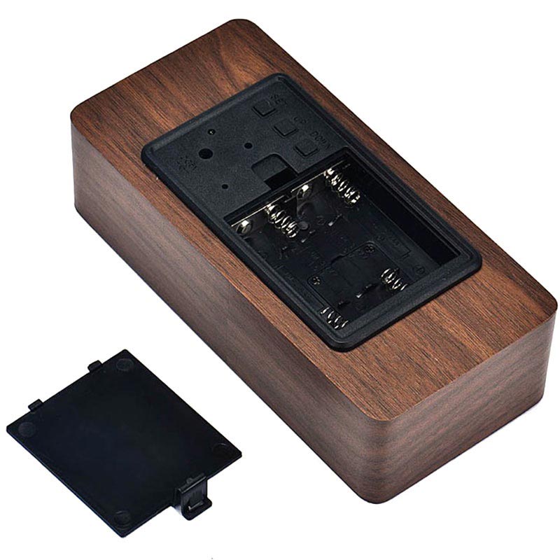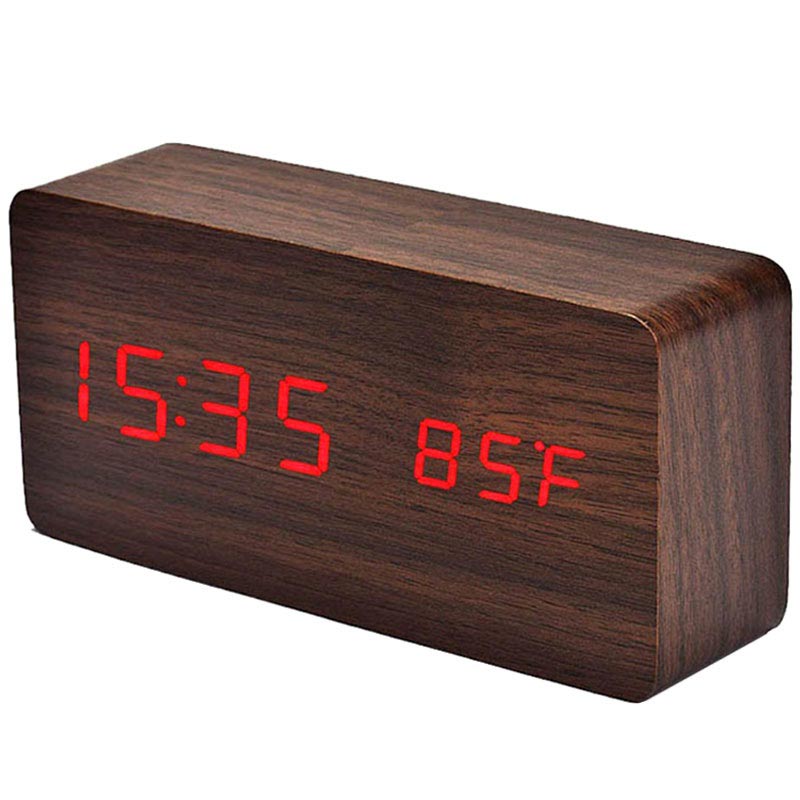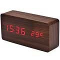 Réveil LED avec un Motif en Bois. Il affiche l'heure en format 12 et 24 heures, et la température en Celsius et Fahrenheit. L'alimentation double permet de le recharger via le câble USB ou des piles AAA.