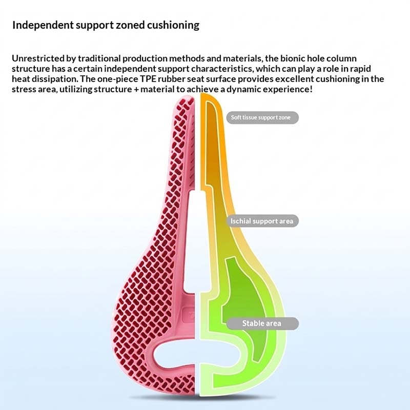 La couche en nid d'abeille en TPE aide à absorber les chocs et à réduire les vibrations de la route, tandis que la rainure creuse centrale est conçue pour soulager la pression et améliorer la circulation de l'air. Avec sa forme profilée, sa construction résistante à l'eau et sa compatibilité universelle avec les rails, cette selle est une amélioration pratique pour les cyclistes qui souhaitent un meilleur soutien au quotidien sans ajouter de poids inutile.