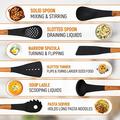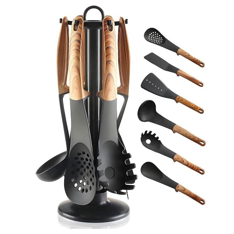 - Collection de cuisine complète de 7 pièces - Comprend tous les éléments essentiels de la cuisine : louche à soupe, cuillère à fente, cuillère solide, spatule à fente, spatule solide, cuillère à pâtes, et un support de rangement assorti.
