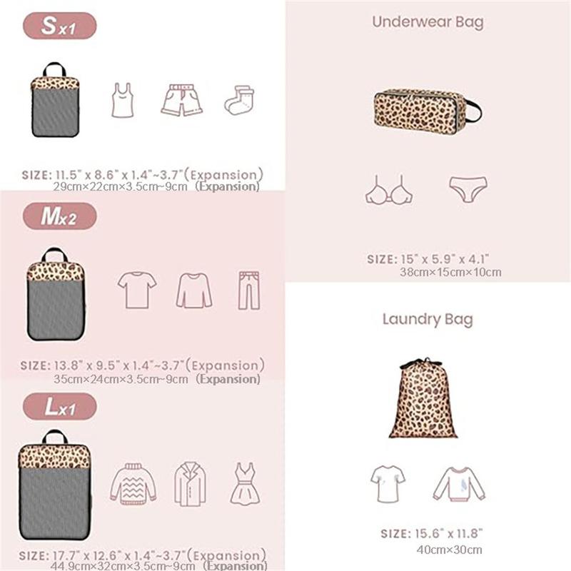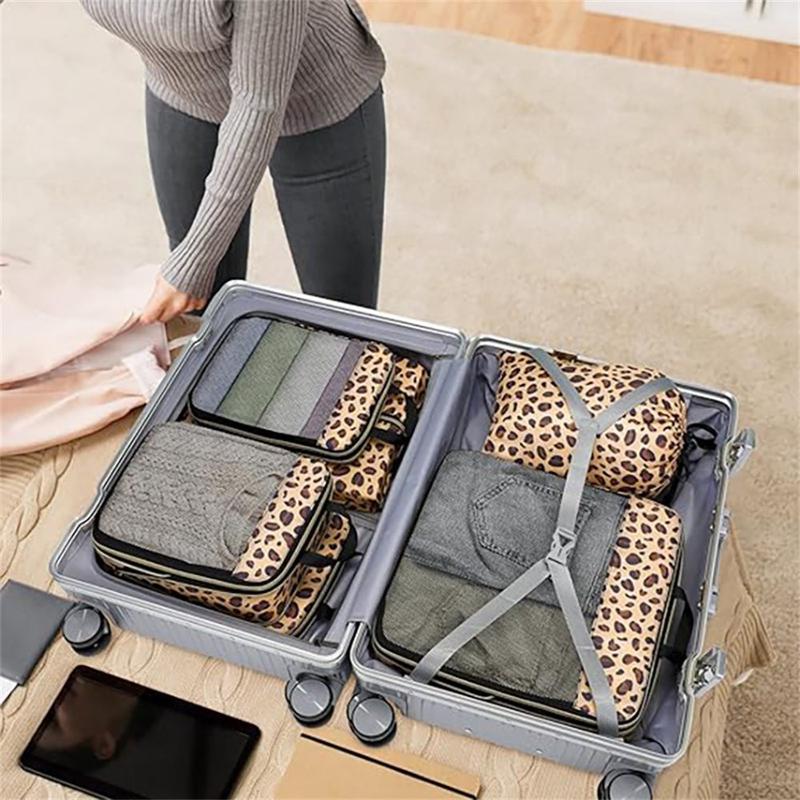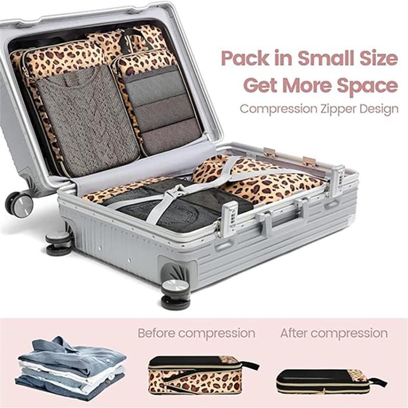 • Kit d'organisation de voyage 6 pièces en imprimé léopard - Sacs de compression peu encombrants pour vêtements et articles de toilette