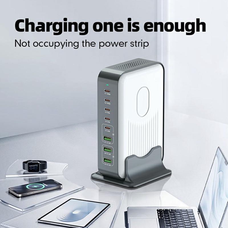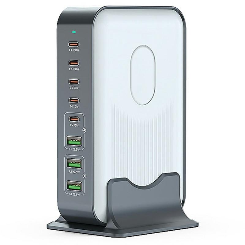 Cette station de charge de bureau WLX-F8B 200W est un hub de charge rapide GaN ultra-puissant conçu pour remplacer plusieurs adaptateurs encombrants par une solution compacte et efficace. Avec cinq ports USB-C Power Delivery et trois ports USB-A Quick Charge, elle prend en charge la charge simultanée d'ordinateurs portables, de tablettes, de smartphones, de casques et d'appareils de jeu, le tout à partir d'une seule prise.