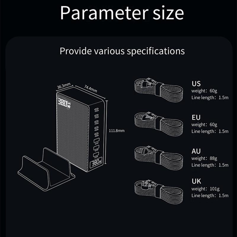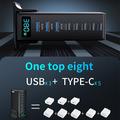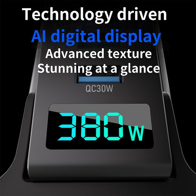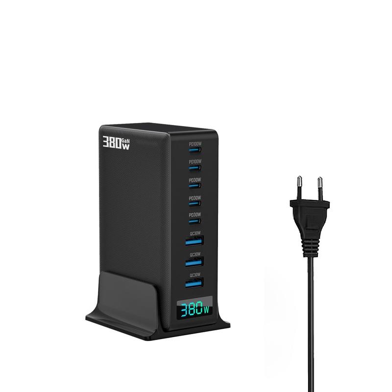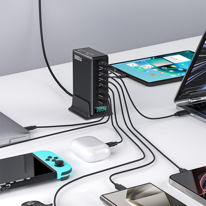 • Station de charge de bureau GaN 380W avec affichage numérique de la puissance - 8 ports (5x USB-C + 3x USB-A), charge rapide USB-C jusqu'à 100W
