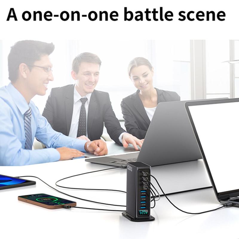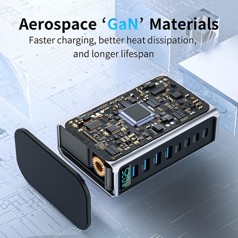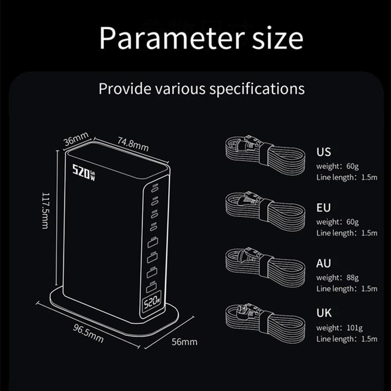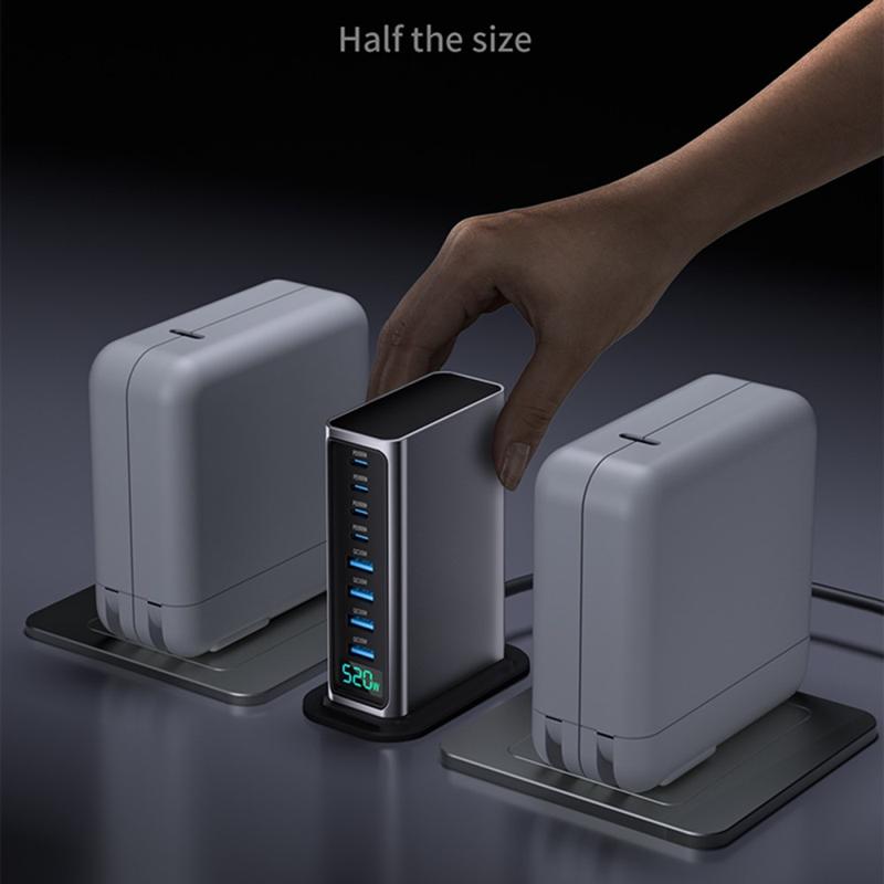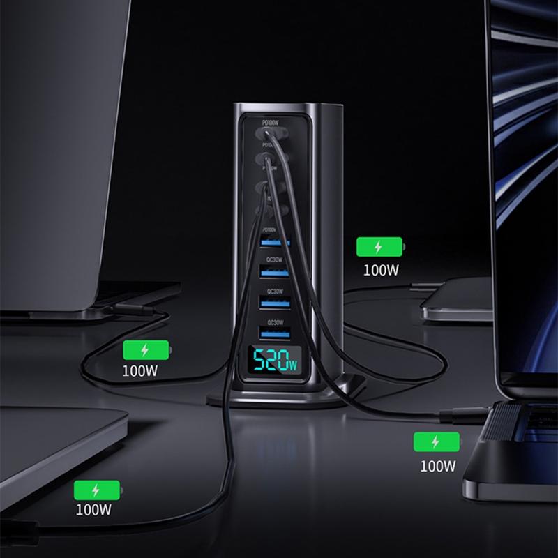 Station de charge de bureau 520W GaN 5.0 avec affichage numérique de la puissance - 8 ports (4x USB-C jusqu'à 100W + 4x USB-A) Chargeur rapide, PPS/PD/QC