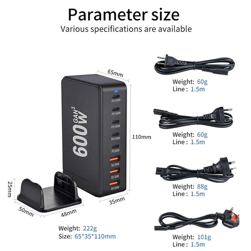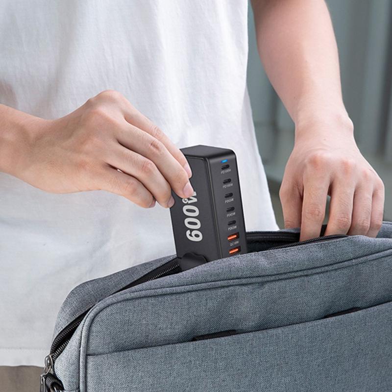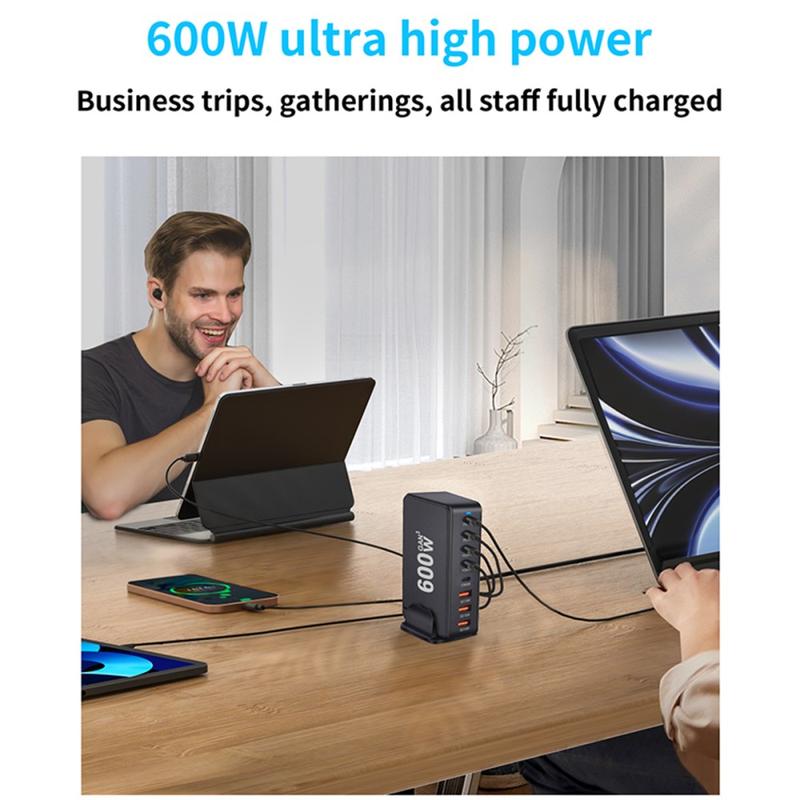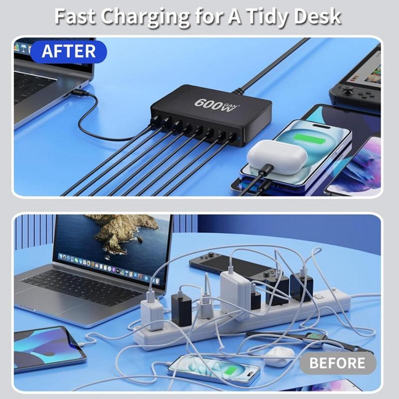• Station de charge de bureau GaN 600W - 8 ports (5x USB-C + 3x USB-A) Chargeur rapide PD3.1, jusqu'à 140W USB-C, distribution d'énergie intelligente
