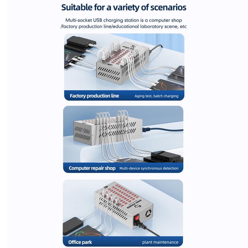 - Postes de travail et ateliers de réparation : rechargez les téléphones des clients et testez les appareils par lots