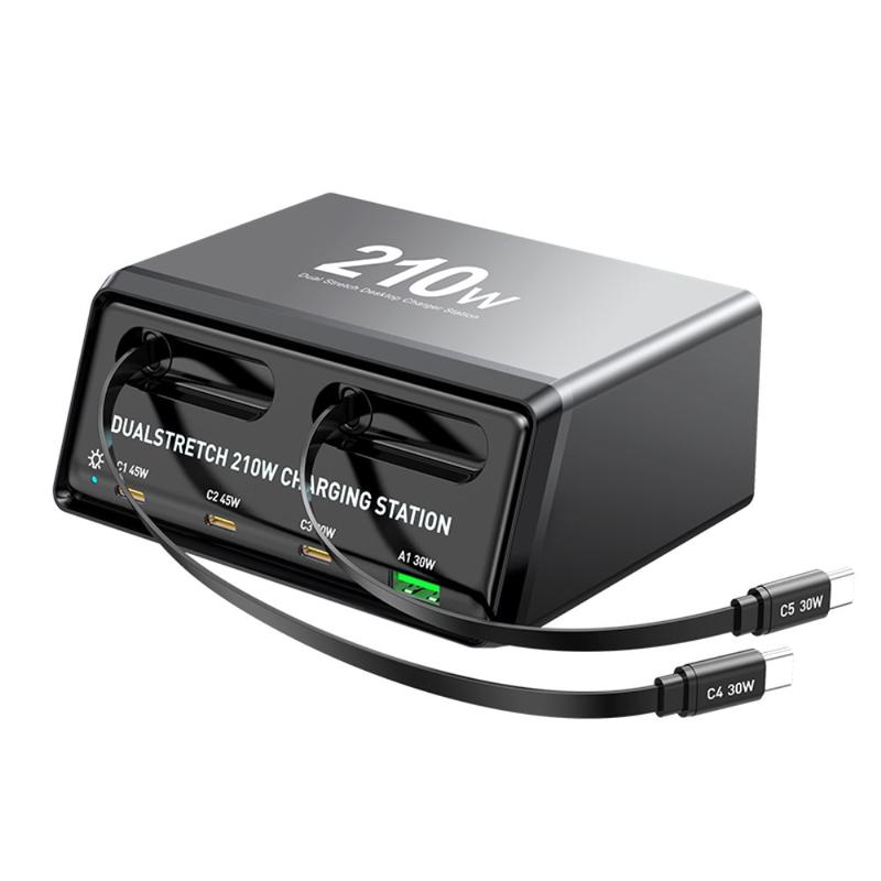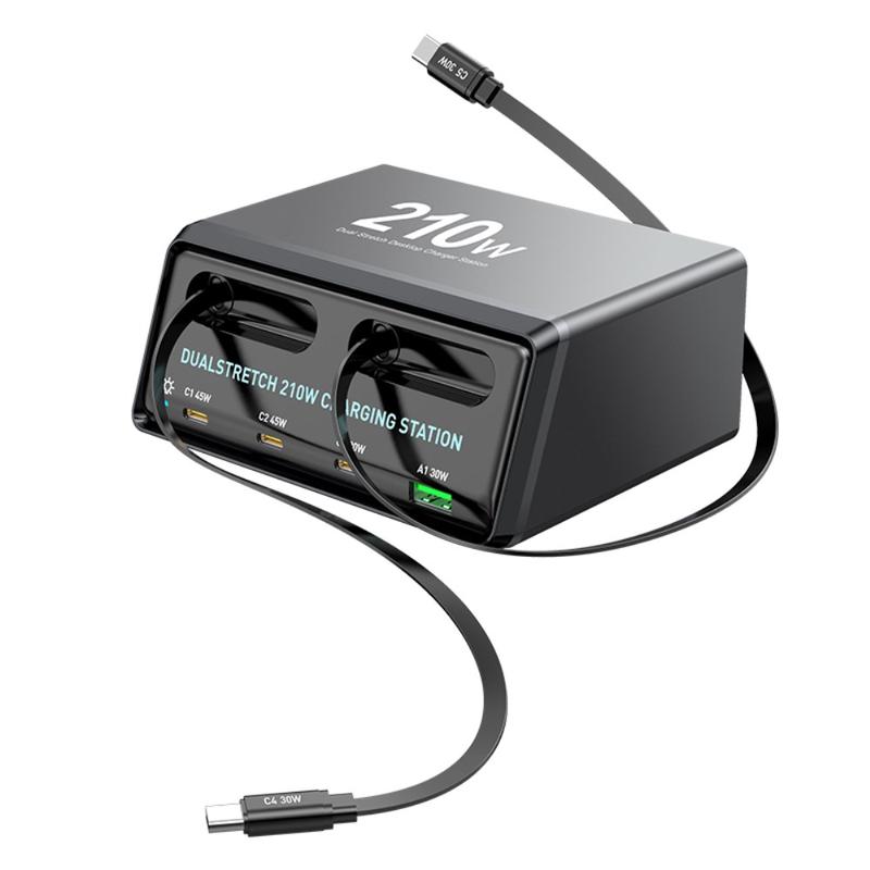 Station de recharge WLX-60E 210W GaN avec 2 câbles USB-C rétractables