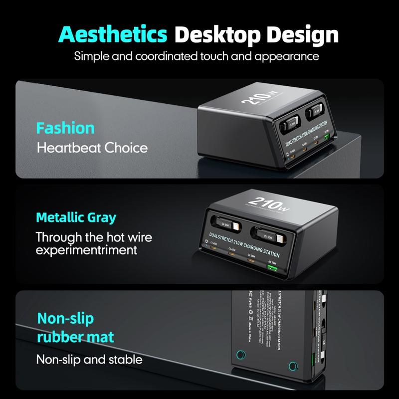 • Chargeur de bureau WLX-60E GaN - 2 câbles USB-C rétractables + 3 ports USB-C + USB-A, jusqu'à 210W